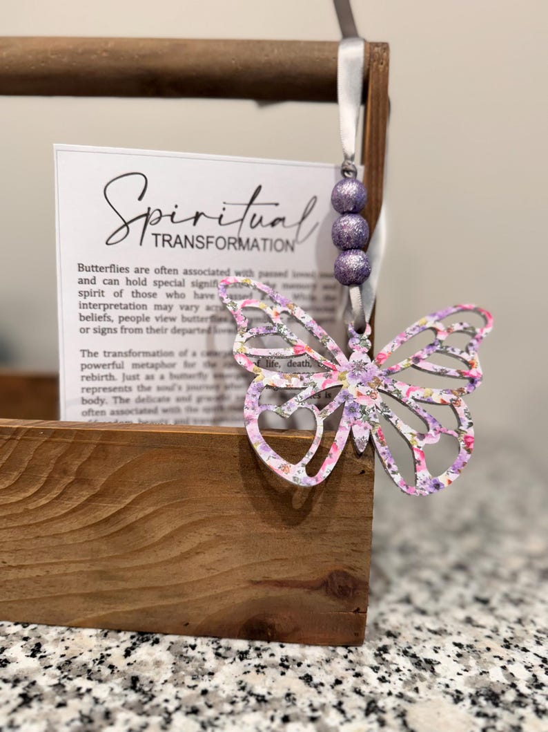 This unique butterfly ornament serves not only as a stunning decorative item for your home but also as a heartfelt memorial ornament to honor loved ones who have passed. Featuring a charming story card ornament that shares the meaning of transformation, it's an ideal friendship ornament to give to someone special or as a thoughtful memorial gift.