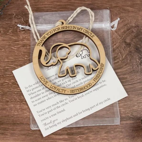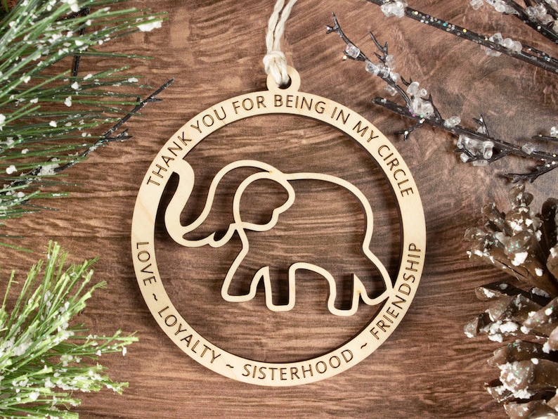 A minimalist elephant friendship ornament featuring the saying: :Thank you for being in my circle" at the top, and the words "Love, Loyalty, Friendship, Sisterhood" on the bottom.