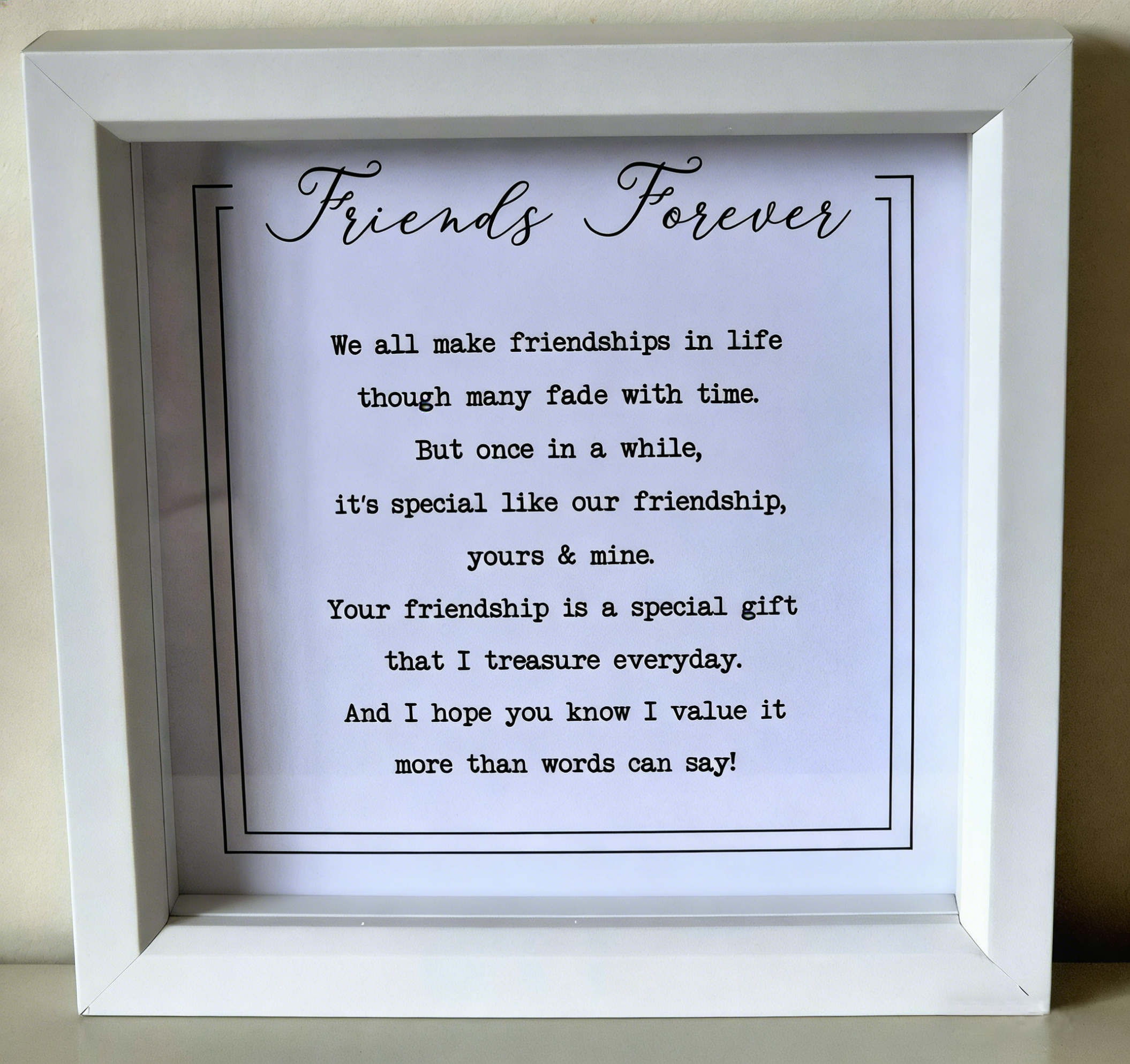 This "Friends Forever" framed poem is the perfect heartfelt gift for your dearest companion. The minimalist white frame highlights the timeless typewriter-style verse, celebrating the unbreakable bond you share.